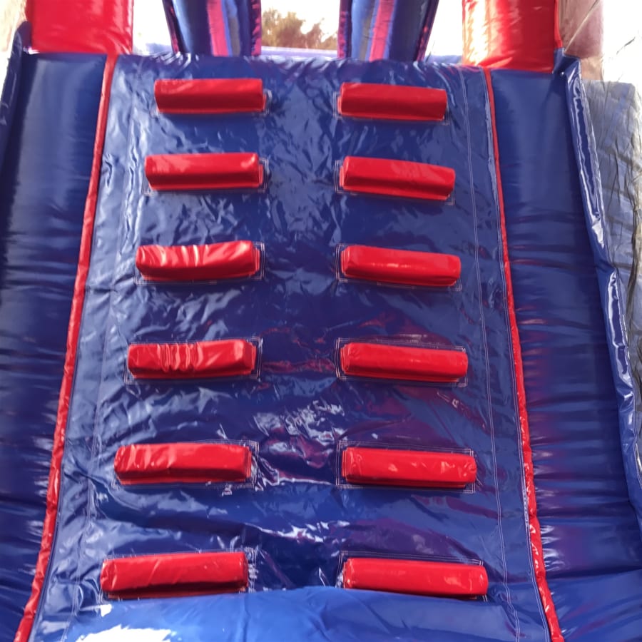 The adventure begins at the tunnelled entrance, where participants encounter two bish bash posts, followed by 'up and under' rollers in a playful bounce area. This section adds to the fun and warms up the participants for the next segment of the course - a sizeable climbing wall that leads up to a large 8ft slide. This thrilling slide is the perfect finish to an obstacle course that promises fun, excitement, and friendly competition.