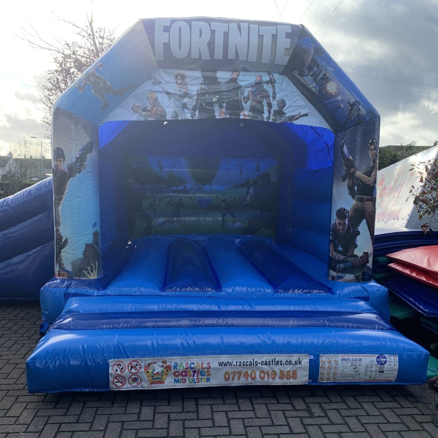 Dive into the world of gaming with our Fortnite Bouncy Castle with Slide! This amazing Bouncy Castles and Slide Combo is available for hire from Antrim to Ballymena and across the Mid Ulster area.