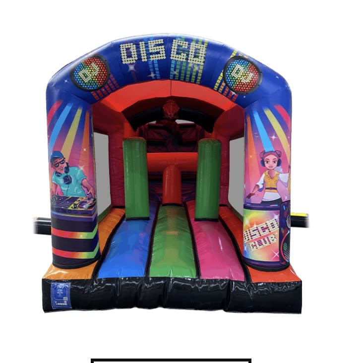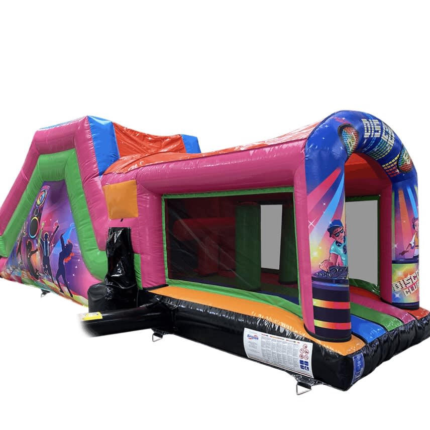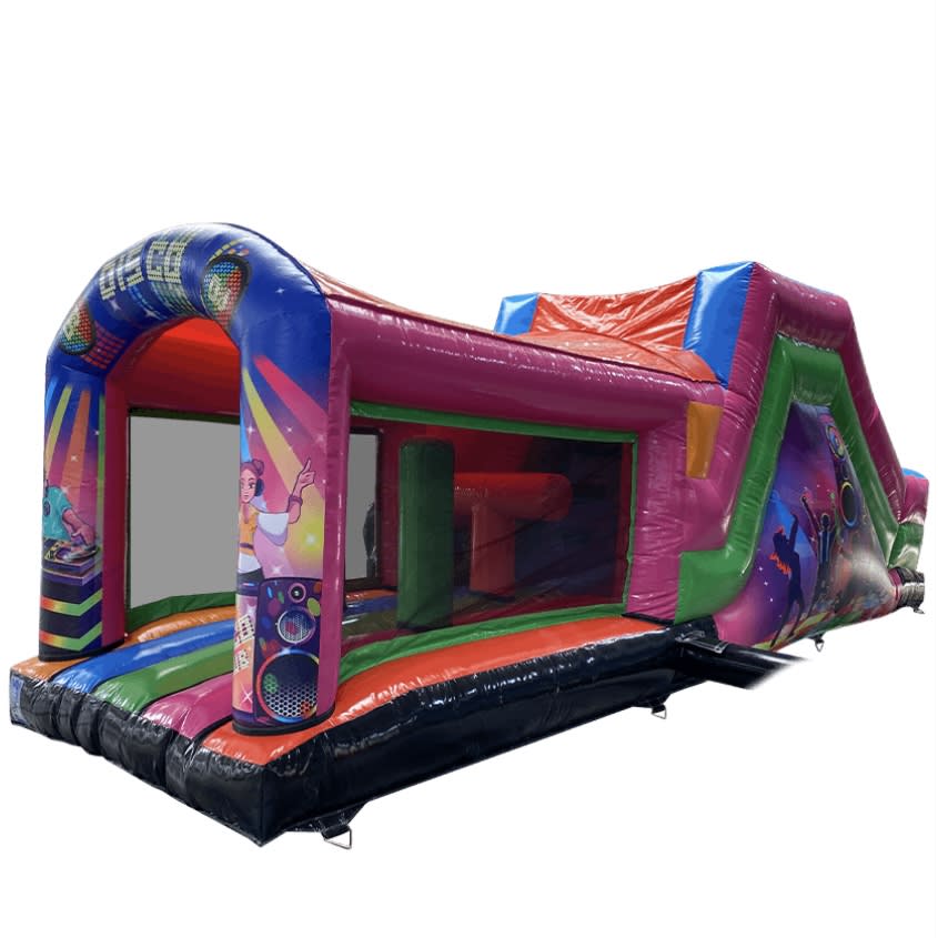 This Disco Obstacle Course is multicoloured, it also comes complete with a rain cover to ensure the weather won't spoil your occasion. This Obstacle Course is suitable for children of 4 years of age right up to adults who want to get involved in the bouncy castle fun themselves.