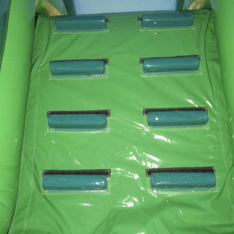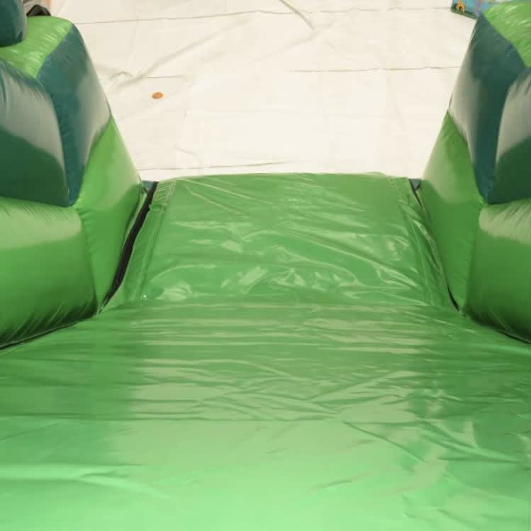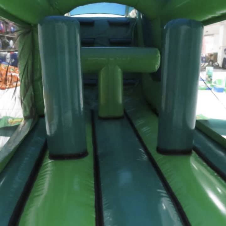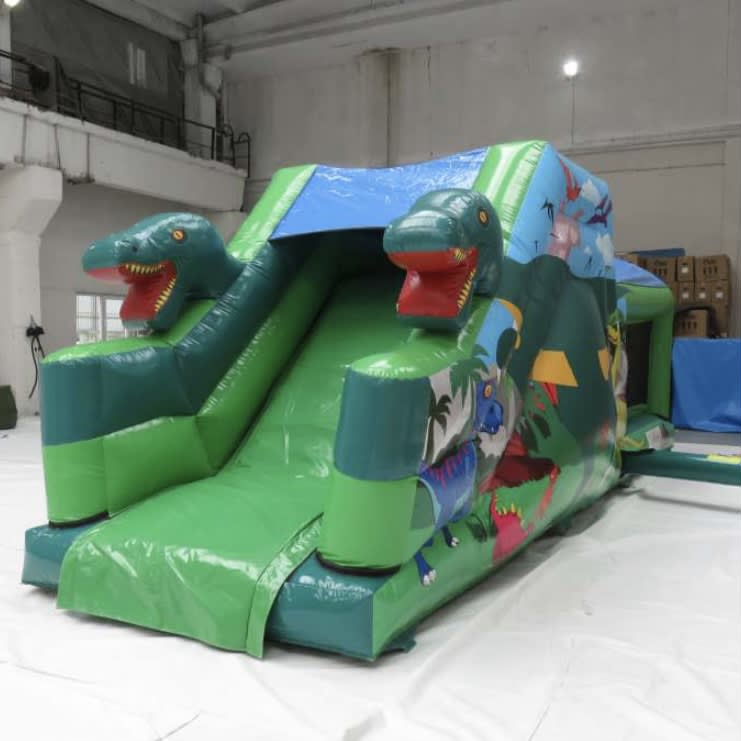 Our dinosaur-themed inflatable is a visual treat, coloured in two-toned green and adorned with amazing artwork, including 3D dinosaur heads on the slide, adding an extra element of prehistoric fun. As children enter the Obstacle Course, they embark on an exciting journey. They'll dash through 2 bish bash poles, tackle the T-bar obstacle, then climb up the wall, leading to the grand finale – an 8ft platform slide.