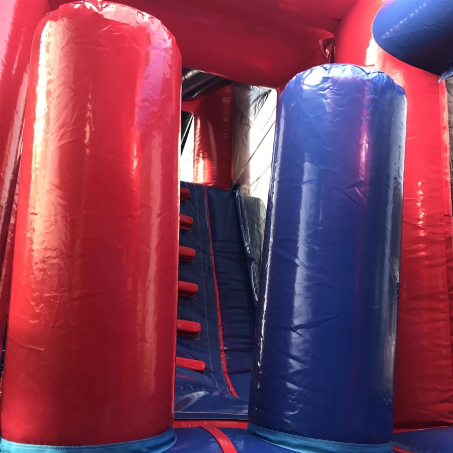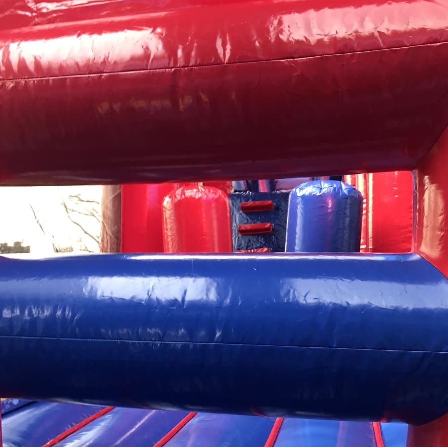 The adventure begins at the tunnelled entrance, where participants encounter two bish bash posts, followed by 'up and under' rollers in a playful bounce area. This section adds to the fun and warms up the participants for the next segment of the course - a sizeable climbing wall that leads up to a large 8ft slide. This thrilling slide is the perfect finish to an obstacle course that promises fun, excitement, and friendly competition.