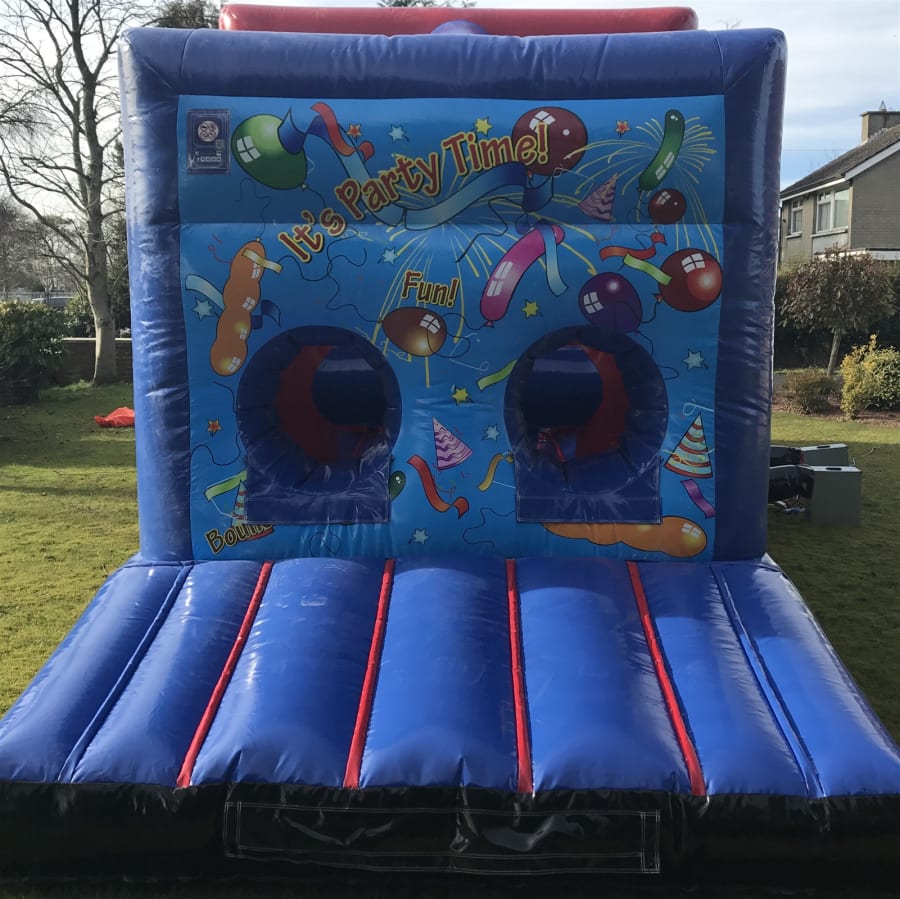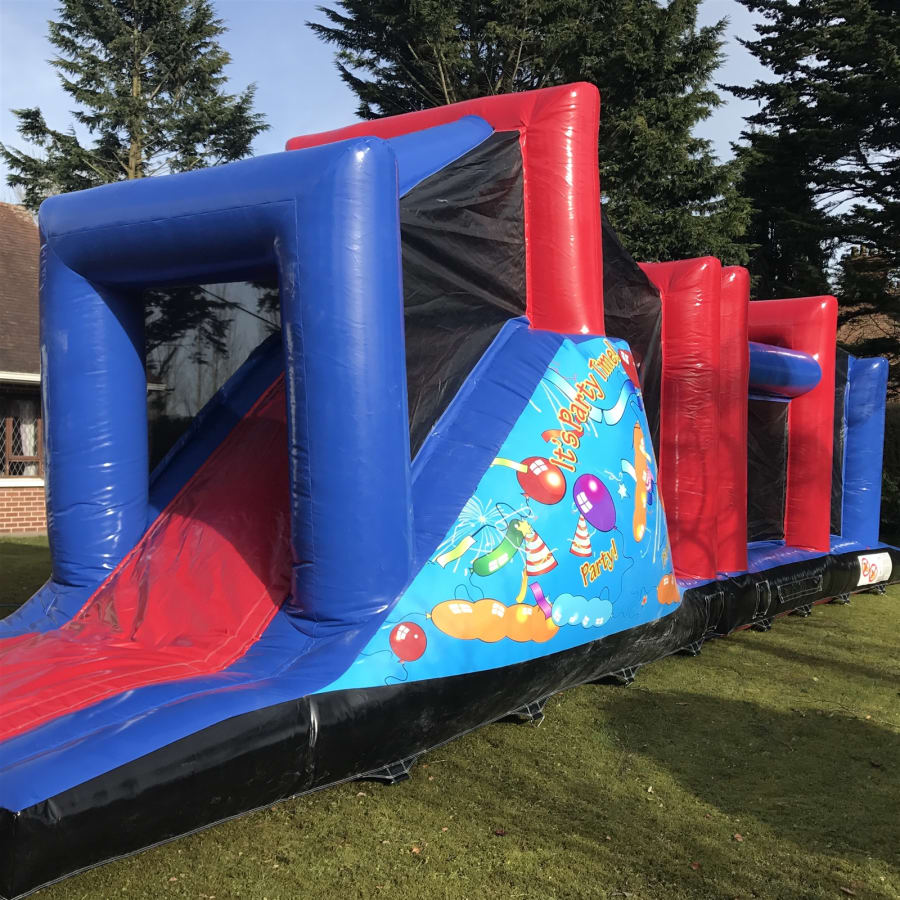 Clad in a lively blue and accented with striking red pillars, it stands out in any setting. The obstacle course features a captivating multi-coloured "Party Time" theme, which adorns both the main structure and the tunnelled entrance, instantly drawing in a crowd ready for fun.