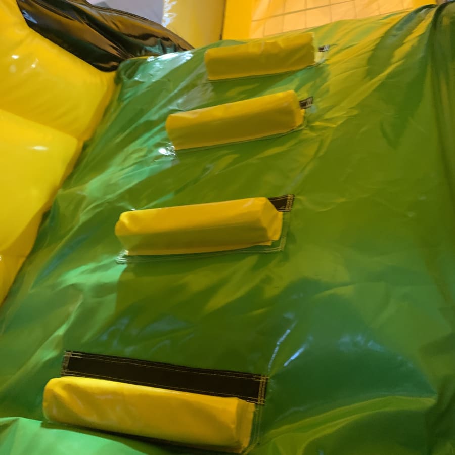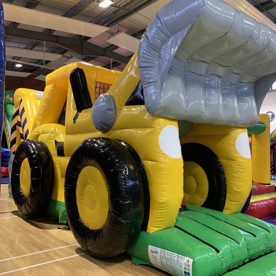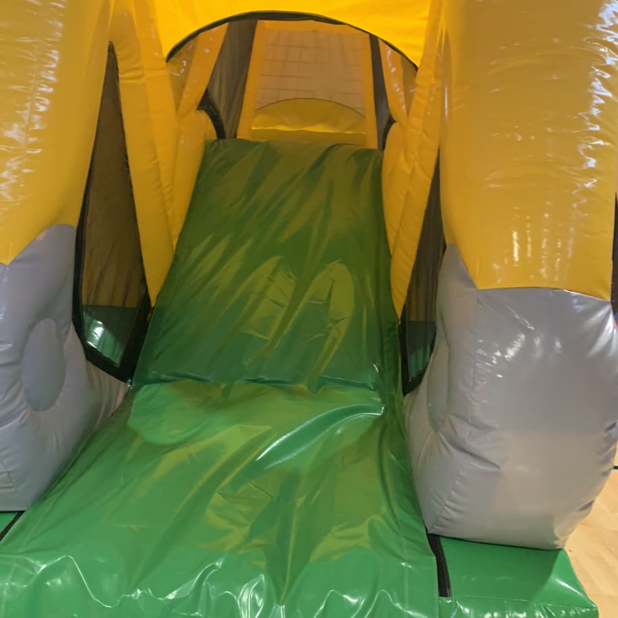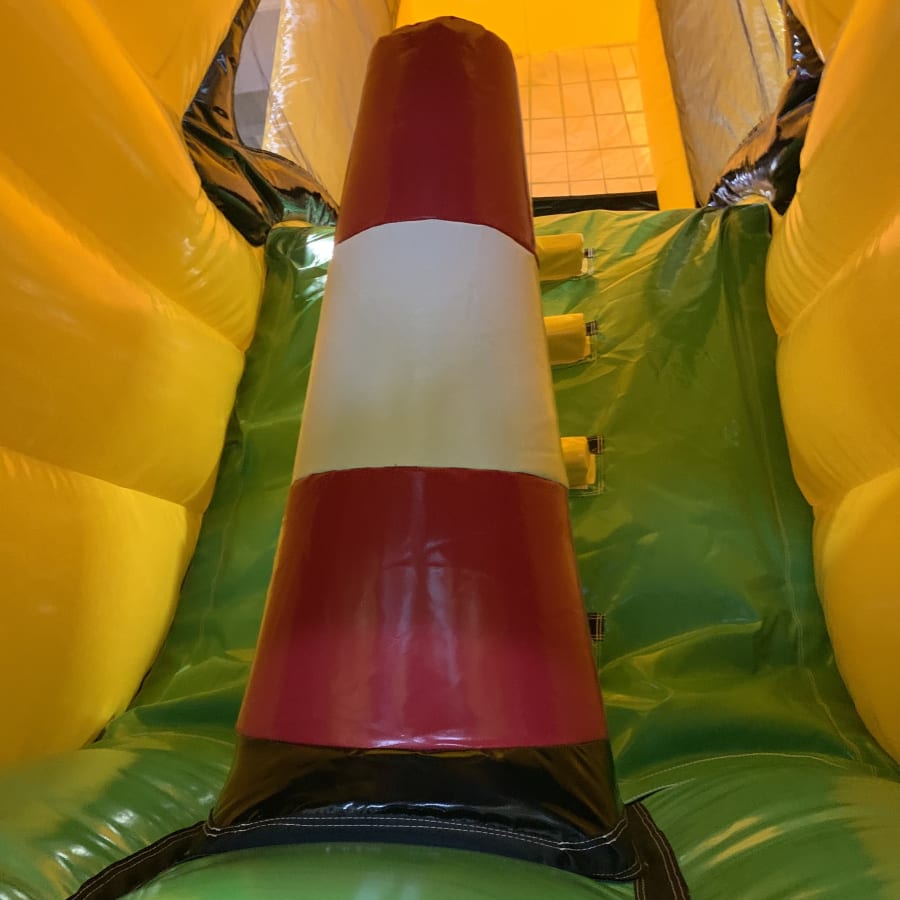 True to its name, the Digger Obstacle Course is predominantly yellow, mirroring the classic look of a real digger. The 3D design adds an element of realism and excitement, making it a standout attraction. As children enter the course, they're greeted with a series of playful challenges. They'll manoeuvre around a traffic cone bish bash pole, duck under or weave through traffic sign obstacles hanging from the roof, and then face the ultimate challenge: climbing to the top of the 8ft platform slide.